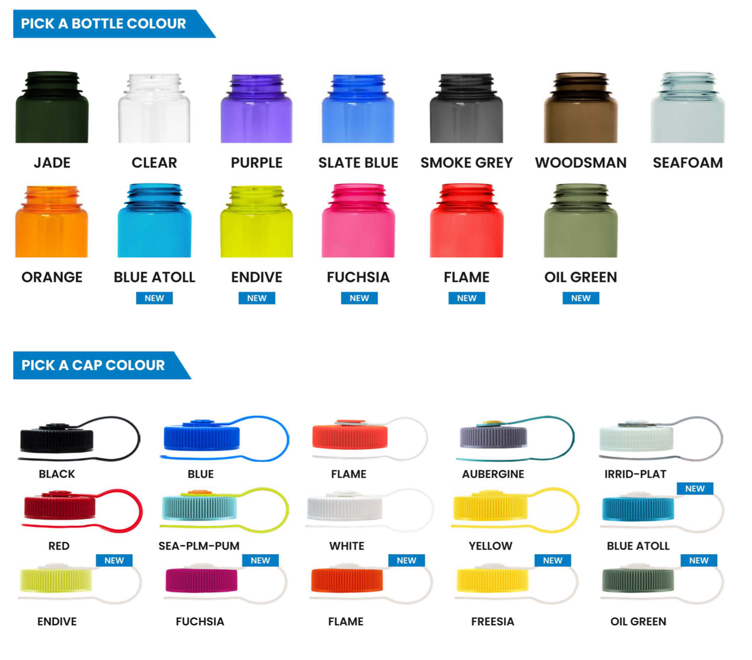 - Mix & match lid colours with bottle colours